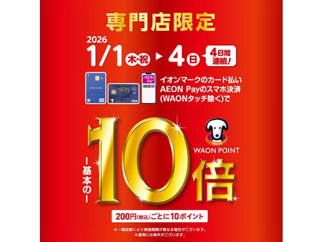 クレジット支払いのご利用、AEON Payスマホ決済にて基本の10倍ポイントが進呈されます。