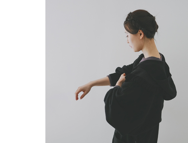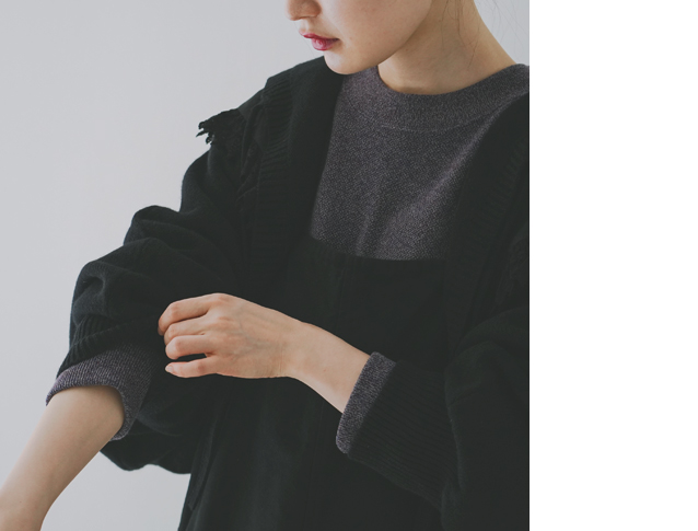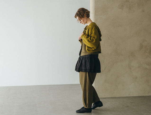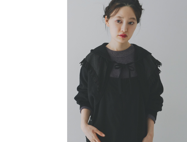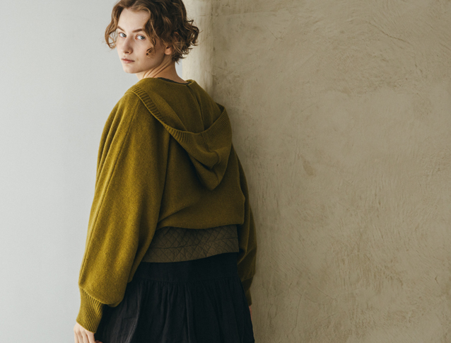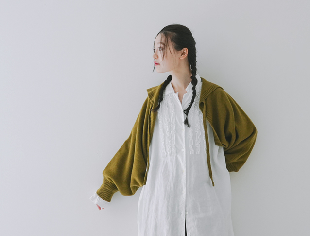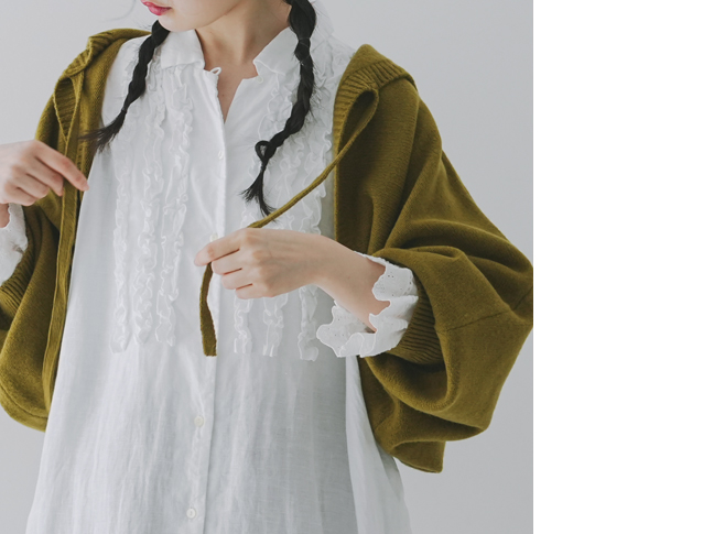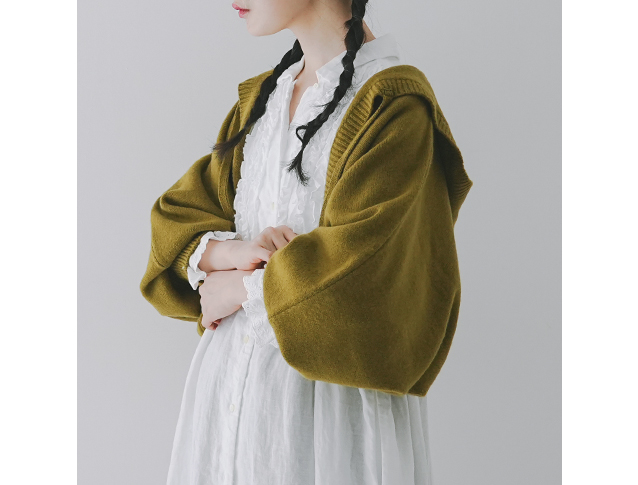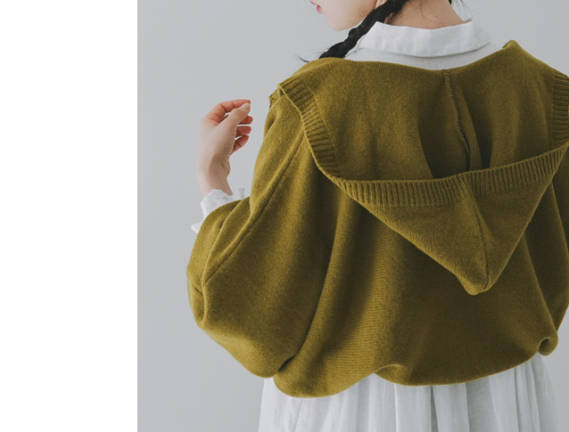 昨年、大変ご好評いただきた「パウダーウールフードリボンカーディガン」に比べて、今回のアイテムはショート丈になっているので、ワンピースやサロペットなどとバランスが取りやすいアイテムに仕上がっています。