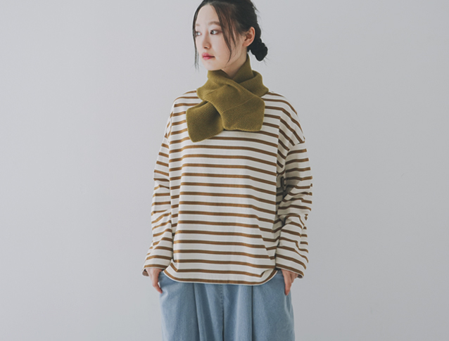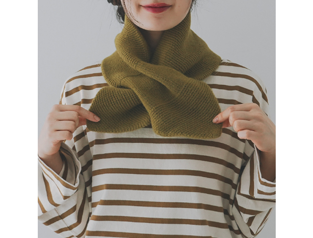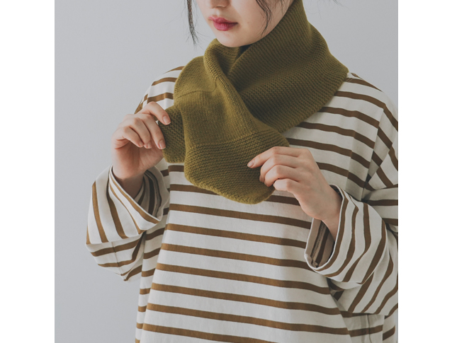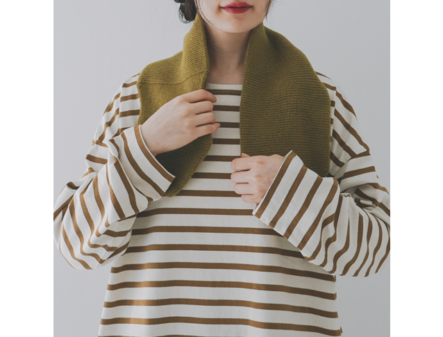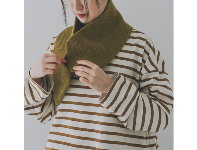 ラムウールマフラーがシンプルなディテールだったのに比べて、ちょっとデザイン性のあるアイテムに。