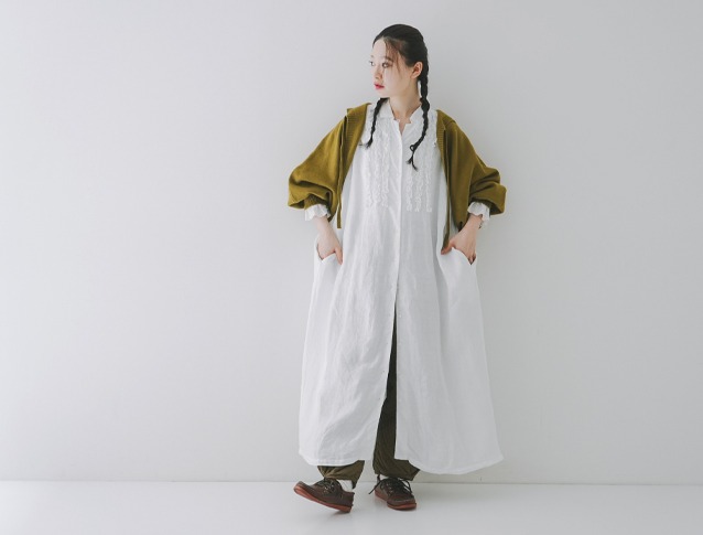 夏っぽい印象の白のワンピースも、オリーブ、カーキ、ブラウン...と
