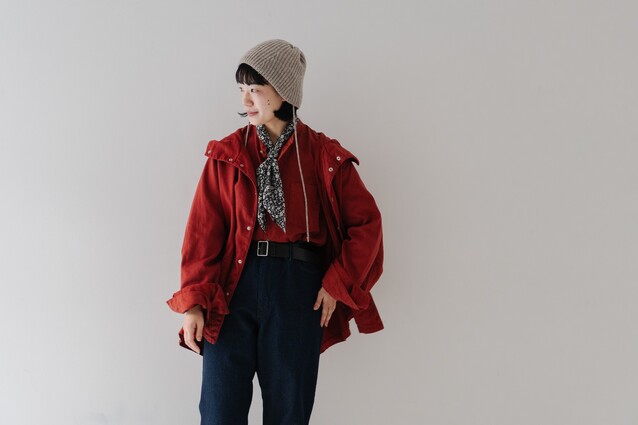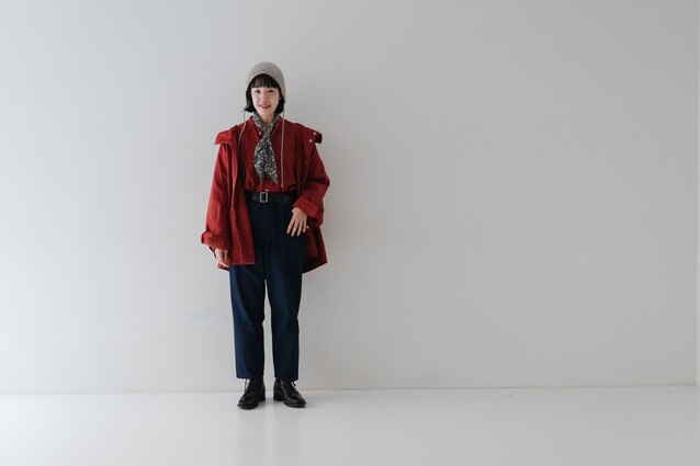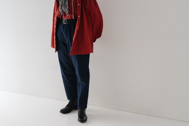 明るめのインディゴに映える深いレッドはCONFECTのもの。