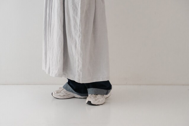 ワンピースにパンツをレイヤードするとき、裾2ロールでやや2クッション出来るくらいの長さで履くこと。