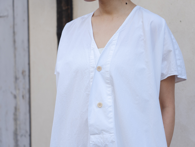 ゆとりのあるシルエットが印象的な、ワイドなクロップド丈のノーカラーシャツです。