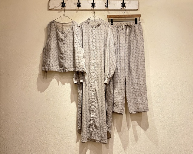 プリント柄が映えるデザインでおつくりしたベスト、ワンピース、パンツの3型。