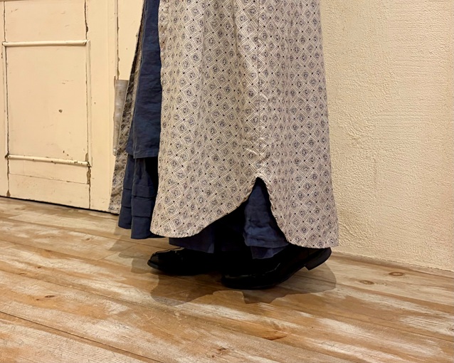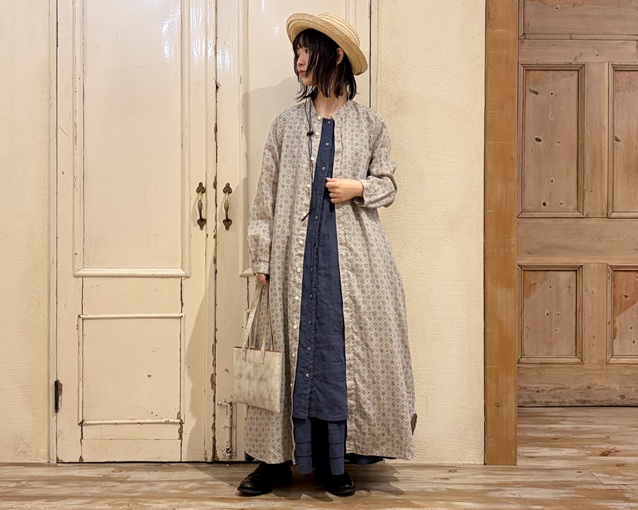 nest Robeらしい麻のナチュラルカラーをベースにした生地に、深みのあるブルー系のプリントを施しました。