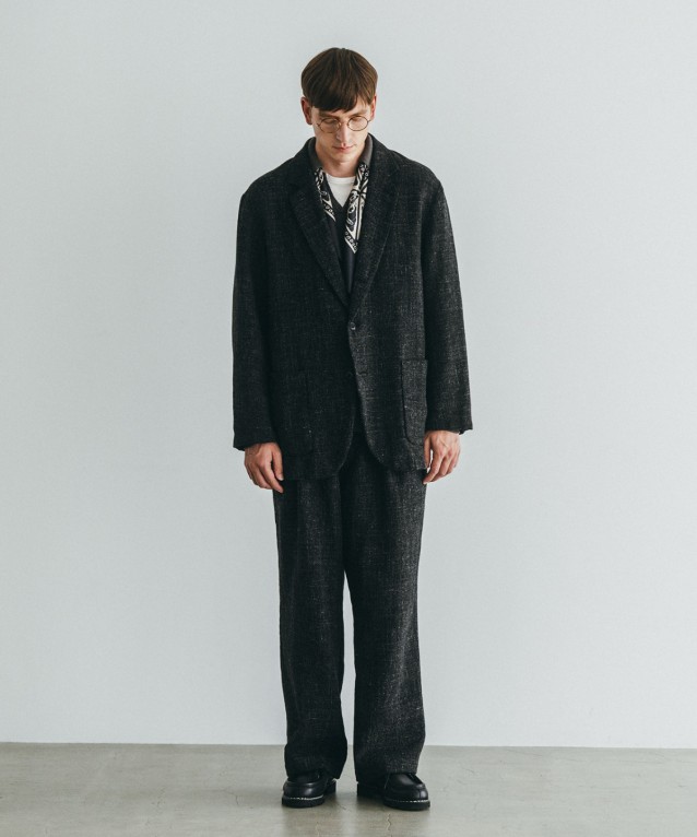 ジャケットは裏地無しで身幅、袖幅共にゆとりがあるので、インナーに合わせるもの次第で着こなしの幅が広く楽しめそうです。