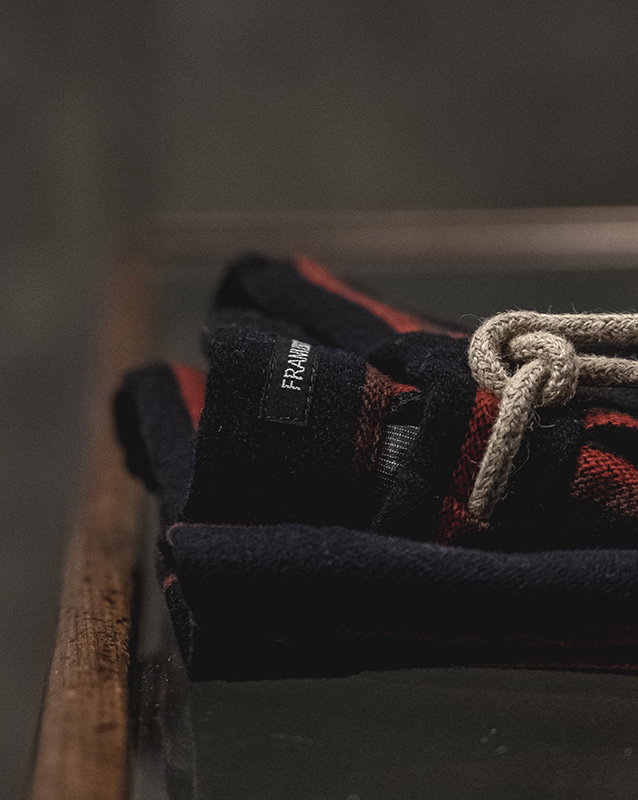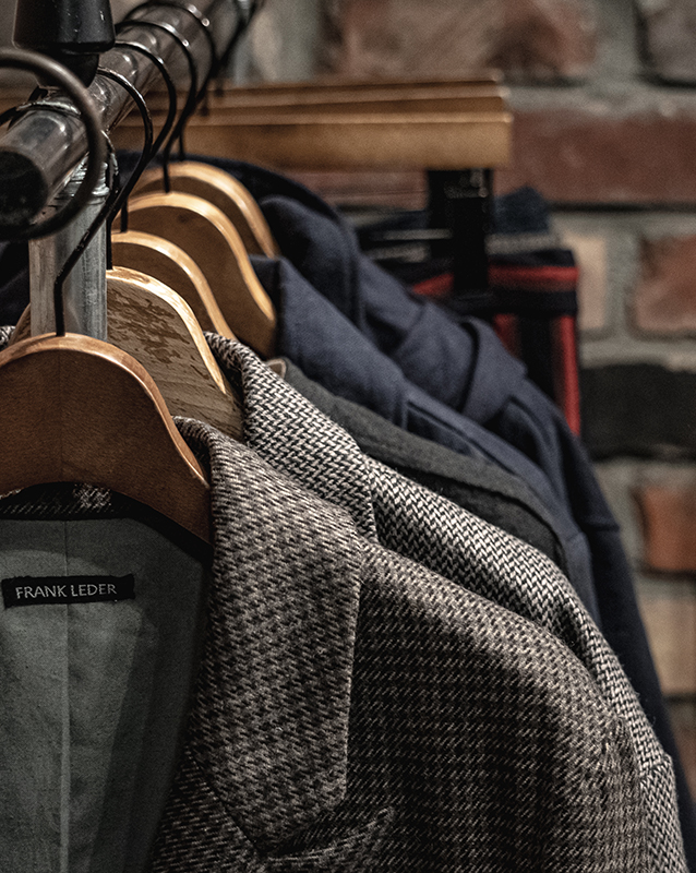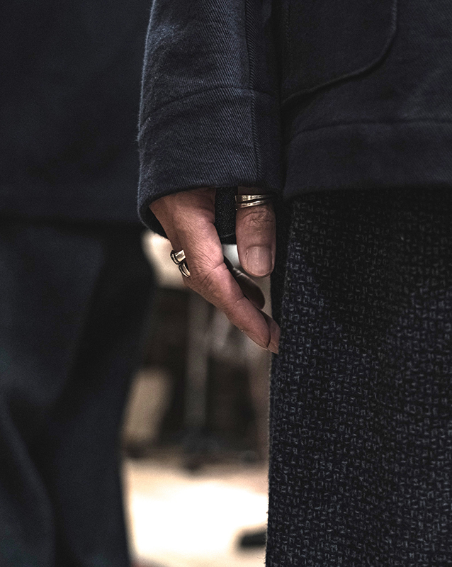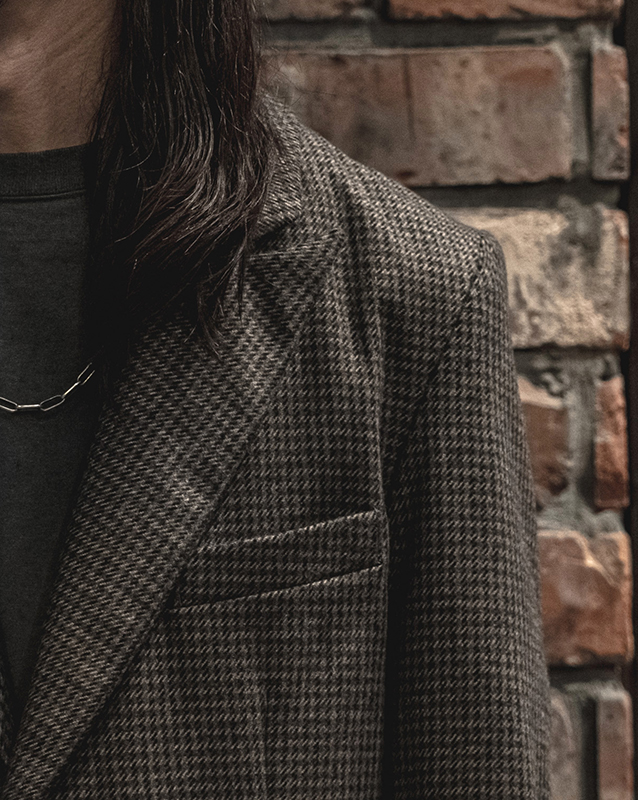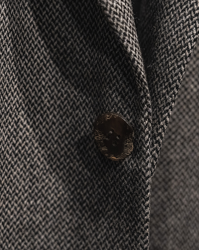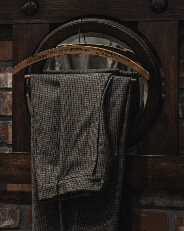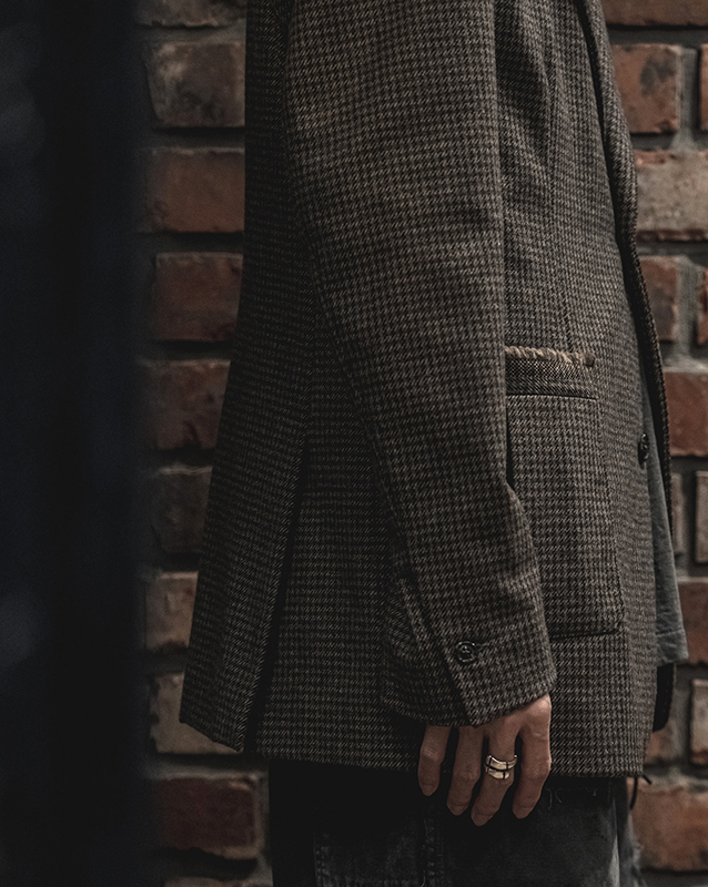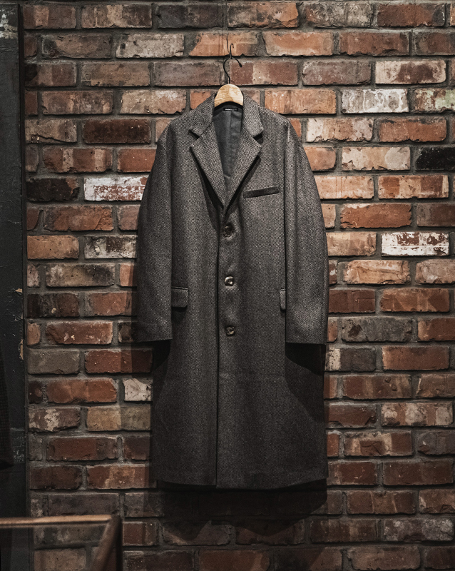 テーラリングのコートやジャケット、トラウザーズはFRANK LEDERの核。フランクリーダー自身が見つけてきたデッドファブリック、生地そのものを主役に、それ以上デザインする必要がない、またファッションサイクルに巻き込まれないフランクのファッションマーケットとの距離の取り方なども感じとることができます。ヘリンボンとも、バリーコーンとも言える織柄は今時代には散見し難い稀有な織物です。