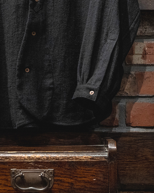 独特な2枚袖になっており、シャツの袖付けとは異なり、ジャケットのようにわずかに袖山がある袖付けのシャツです。そのため袖には前振りがかかっており着用時のフォルムはとても美しく素材の柔らかさや落ち具合と相まってエレガントなムードがあります。シャツが下着として扱われていた時代の名残となる、前立て下の持ち出しカーブは、一つのデザインアクセントとして楽しみいただけます。