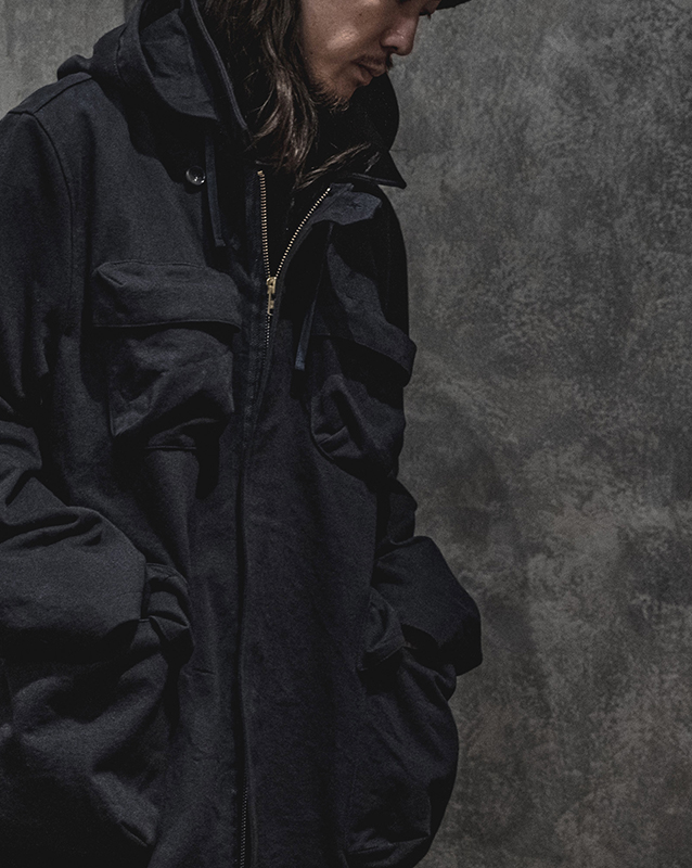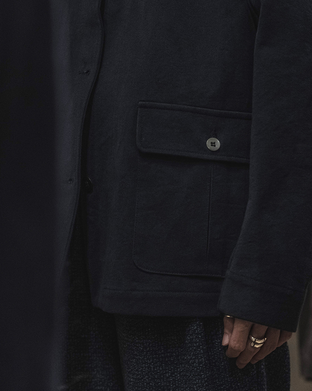 僕がこのブランドを知ったきっかけのアイテムがジャーマンレザーのアイテムです。15年前からジャケット、パンツを所有しており、毎年着ています。初めは、作品的な要素を感じ敬遠していましたが、実際に着てみると、体に馴染んできたり、冬は暖かく感じれたりと、実用的です。ウール素材以外で、これほどの厚みの上着やパンツはほとんどないと思いますし、ウール素材でない ことや、この生地の歴史的な背景を感じることで、ちょっと雑にいつかって味を出し、洗ってくったりとさせたりと、日常に馴染ませていく、そんなモチベーションで付き合える一着です。