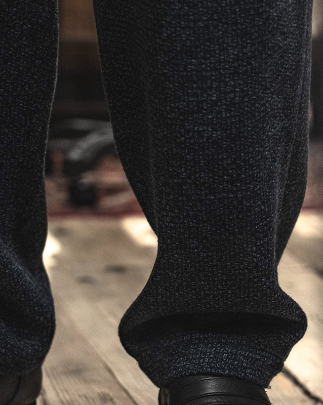 複数本を撚り、杢調の糸を経緯に引いたウール織り物のパンツ。黒よりも圧倒的にネイビーを主体とするFRANK LEDERらしい青味が強いネイビー系の色味です。